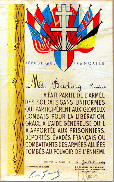 "A fait partie de l'armée des soldats sans uniformes qui participèrent aux glorieux combats pour la liberation, grâce à l'aide génereuse qu'il a apportée aux prisoniers, déportées, évadés français ou combattants des armées alliées tombés au pouvoir de l'ennemi."