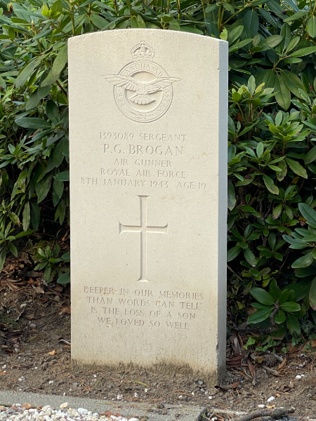 Sergeant. No. 9 Squadron RAF, boordschutter. Zoon van Patrick Michael Brogan en Florence M. Brogan (née Kilpatrick) uit Elibank Road Shooters Hill Greenwich London.